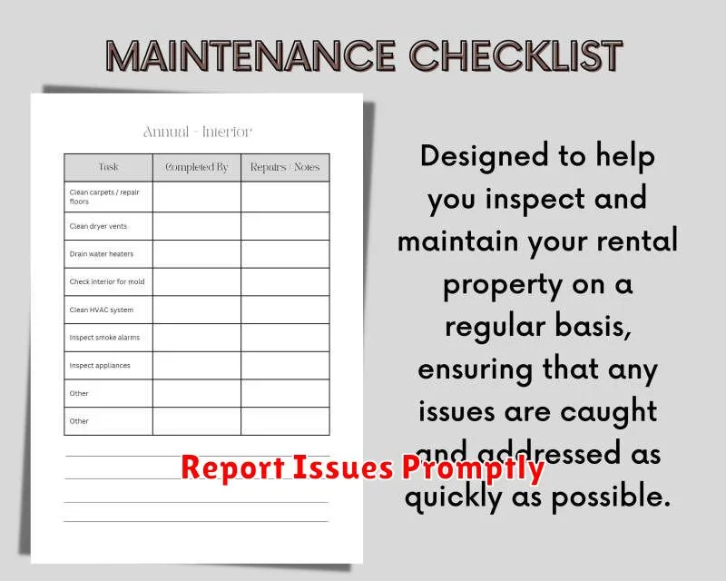 Timely reporting is crucial for effective property maintenance. Promptly reporting issues helps prevent further damage and ensures a faster resolution. A small leak, for example, can escalate into a significant problem if left unattended. Similarly, a minor electrical issue can become a safety hazard if not addressed quickly.